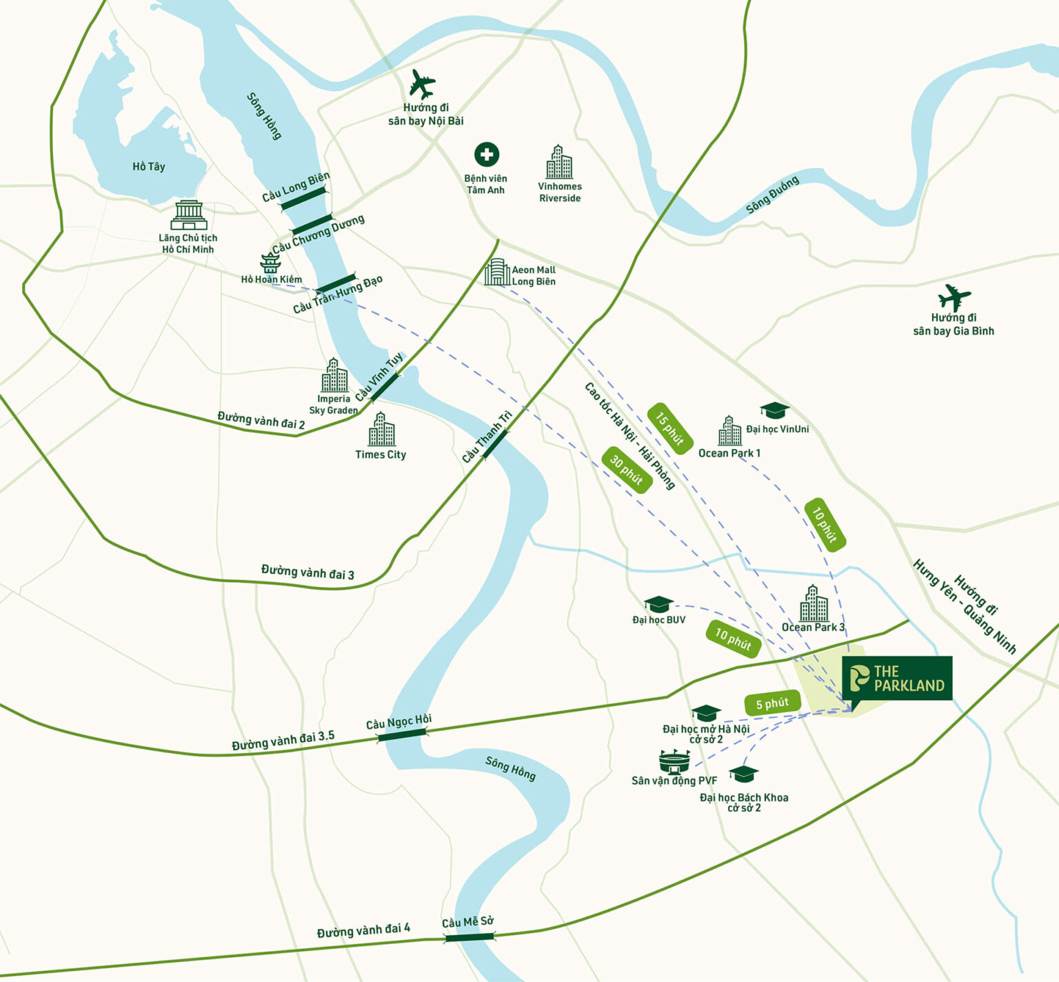 Kết nối ngoại khu: Lợi thế cửa ngõ phía Đông Thủ Đô với hạ tầng mới được đầu tư mạnh mẽ. Từ The Parkland, bạn có thể: